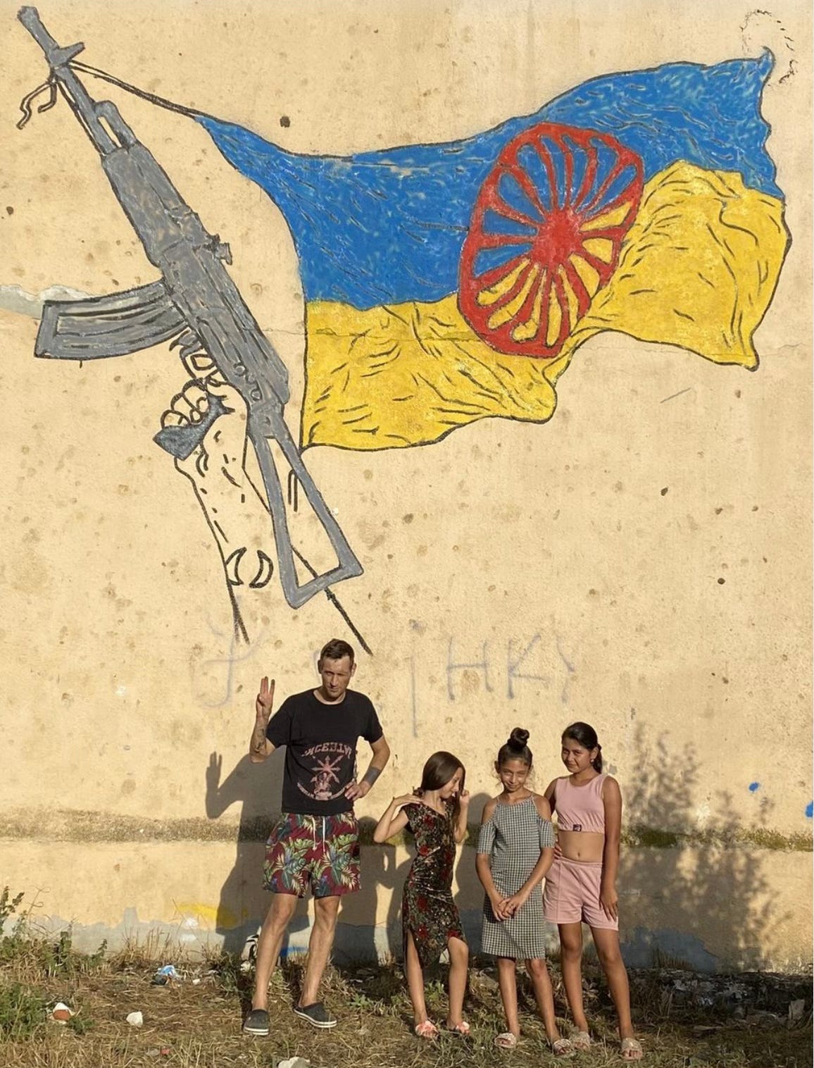 Davyd Chichkan in front of a mural dedicated to Roma fighters in the Ukrainian Army created in the Roma populated district of Uzhhorod, 2022.