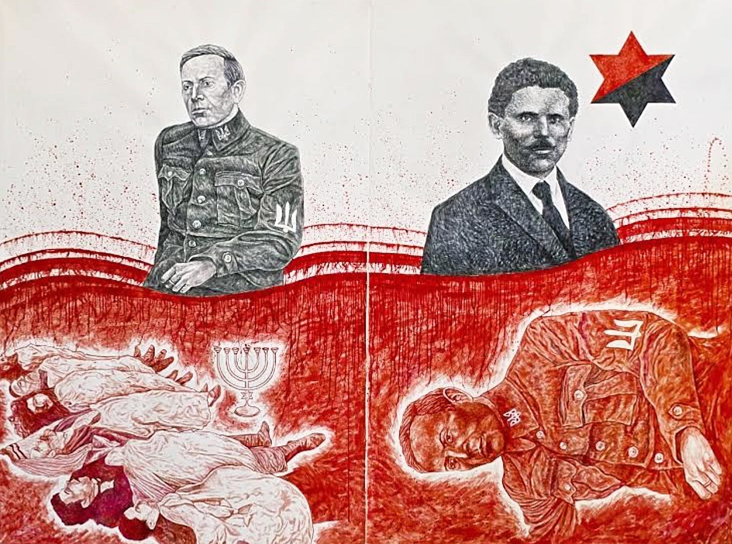 This hatred is understandable given Chichkan’s focus on difficult and tragic chapters of Ukrainian history that clash with the nationalist narrative of heroic struggle for independence. One striking example is his double portrait Revenge, depicting Symon Petliura—the Supreme Commander of the Ukrainian People’s Army and leader of the Ukrainian Peoples Republic—and Sholem Schwarzbard, a Jewish anarchist who assassinated Petliura in Paris on May 25, 1926.
