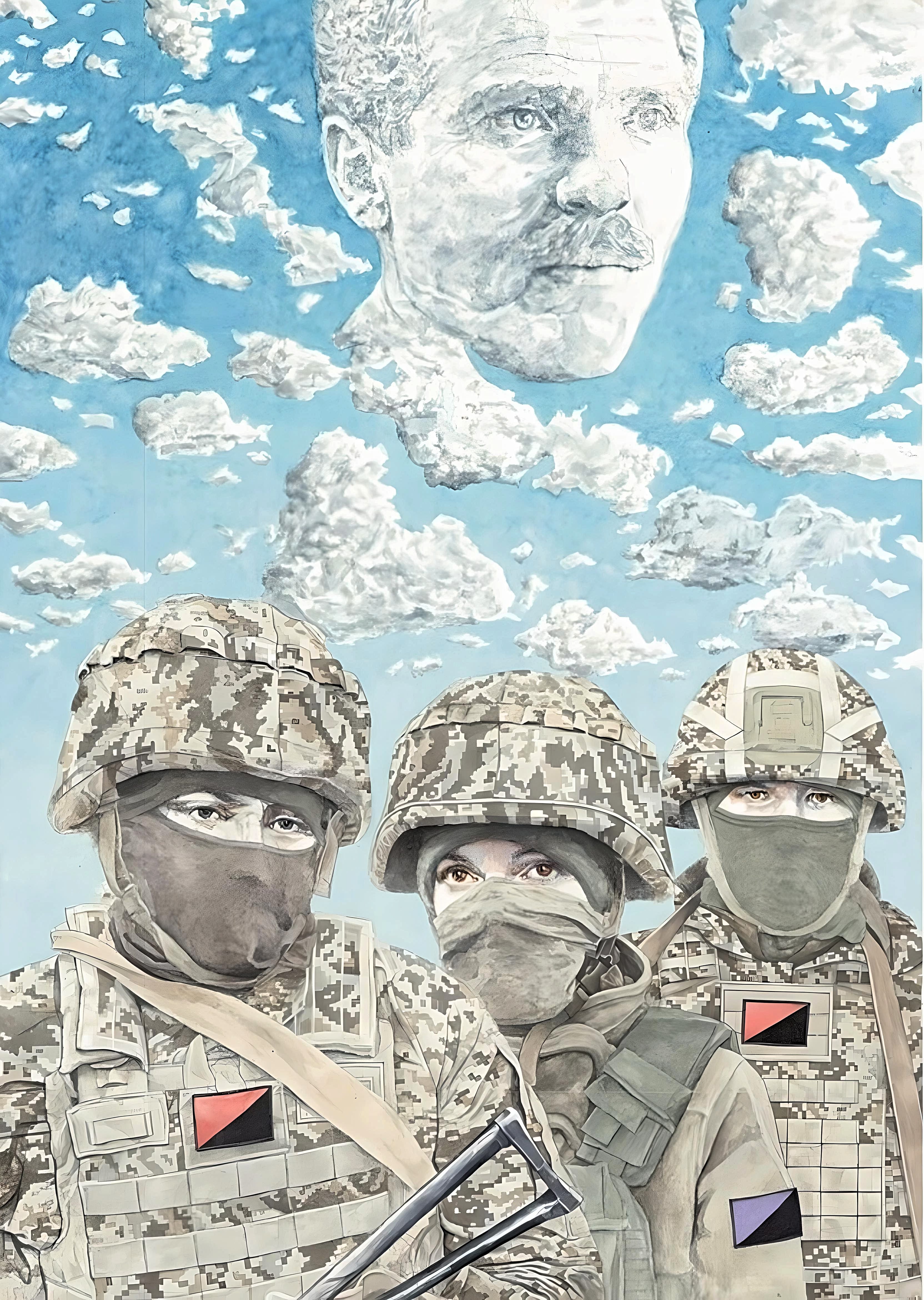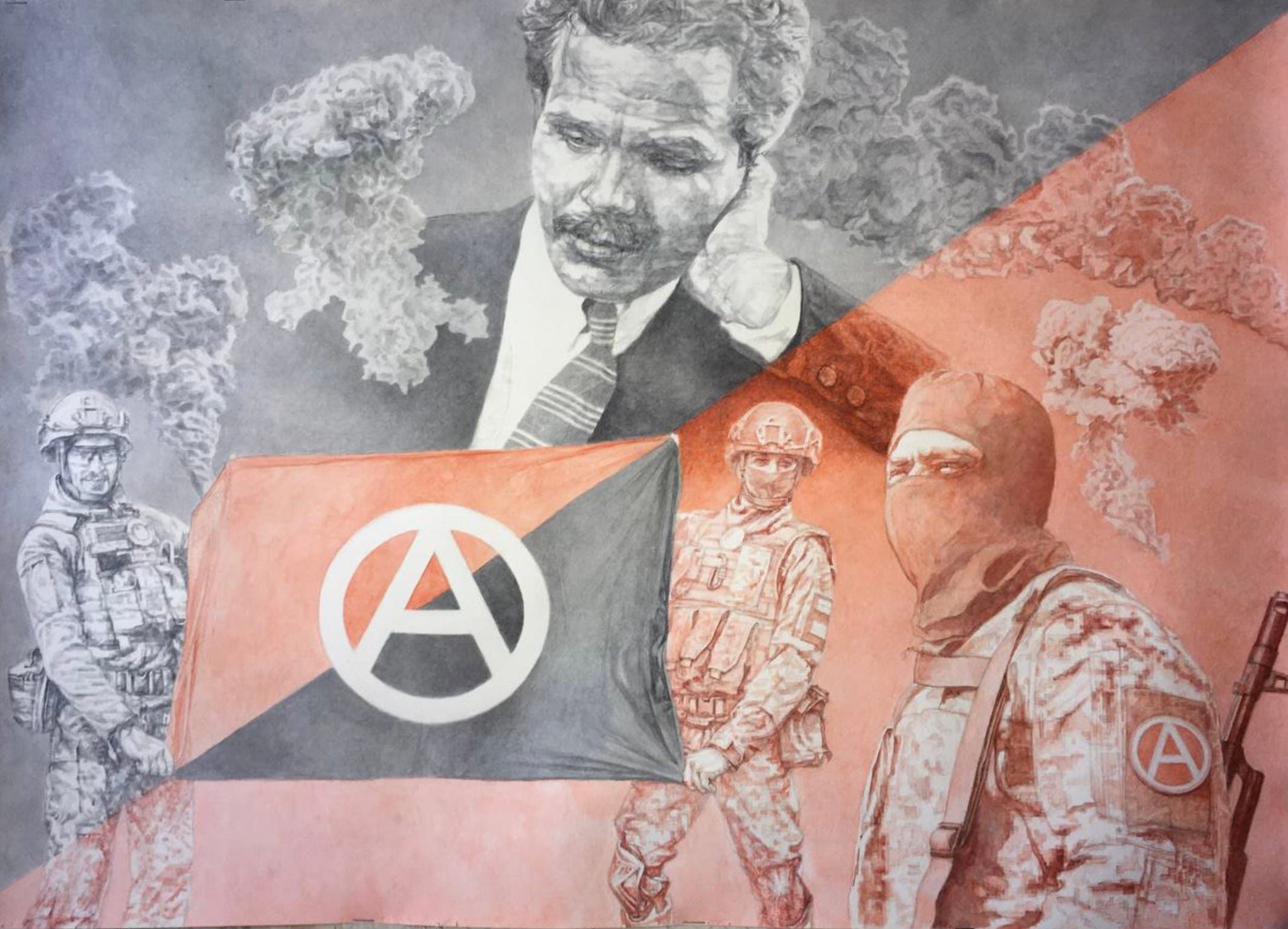 One of the works from the Odesa exhibition depicts Nestor Makhno, the leader of the Ukrainian anarchists in the 1920s, alongside Ukrainian anarchists fighting today on the front lines.