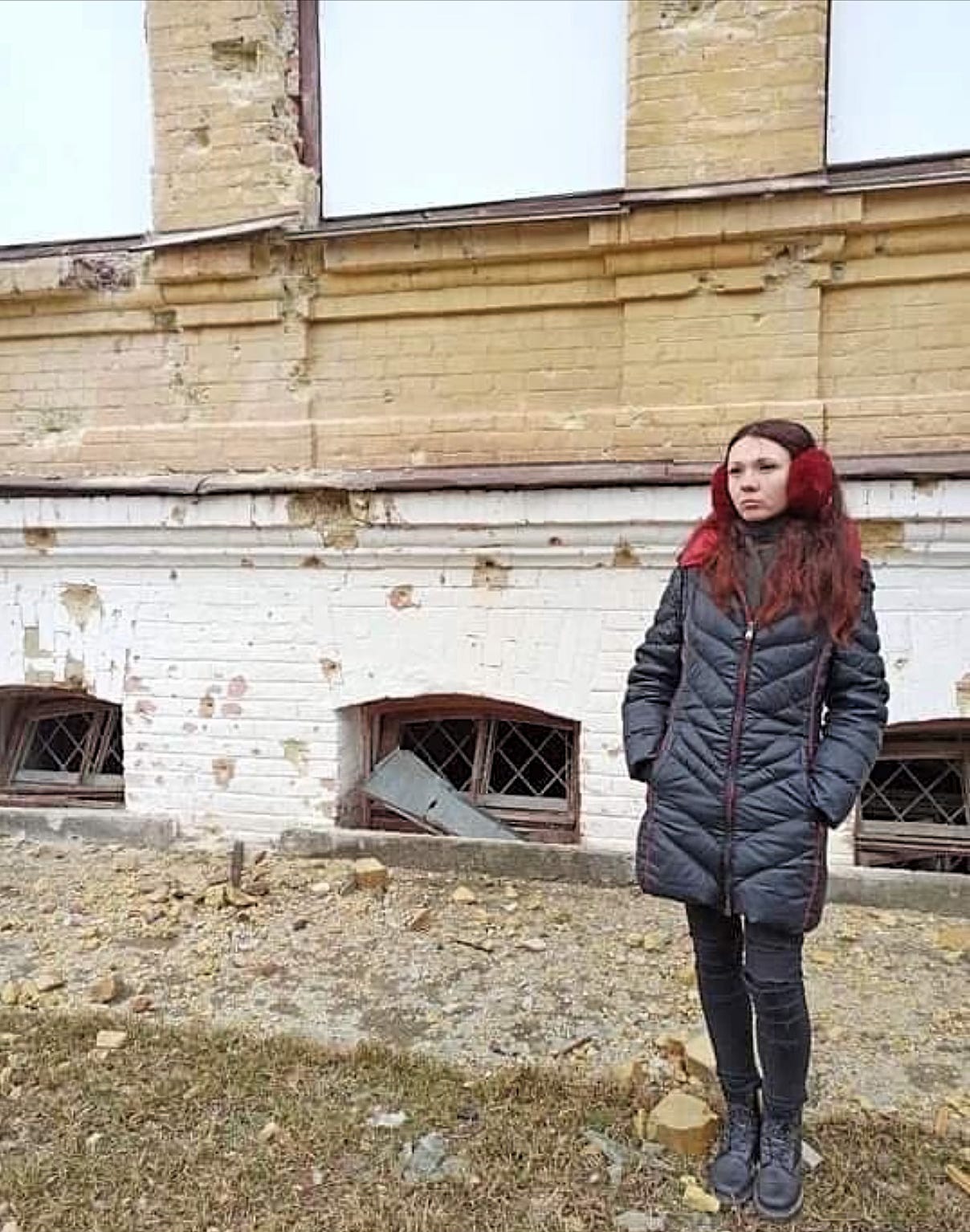 Maryna Hrytsenko in the front of the museum building. April 2022